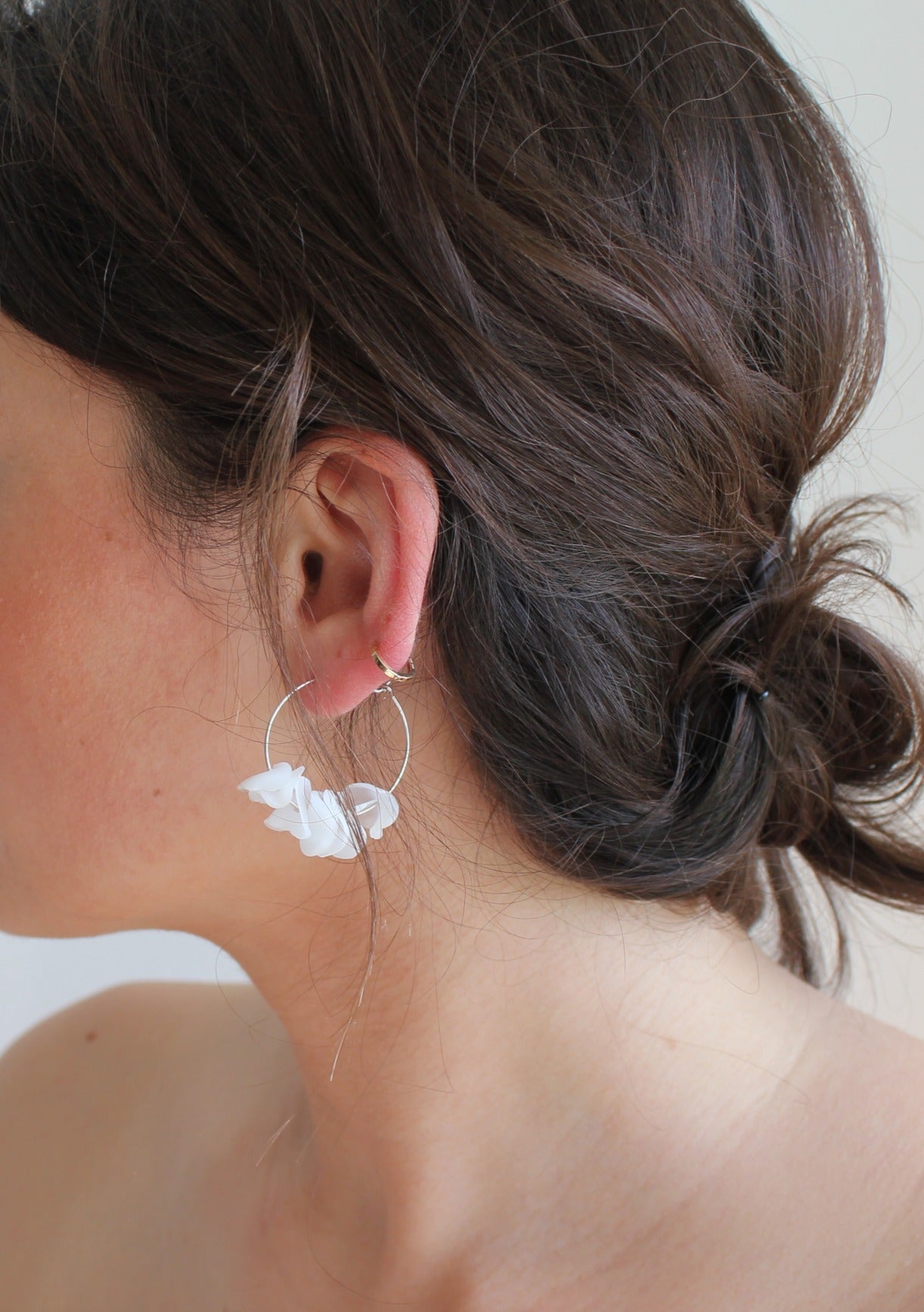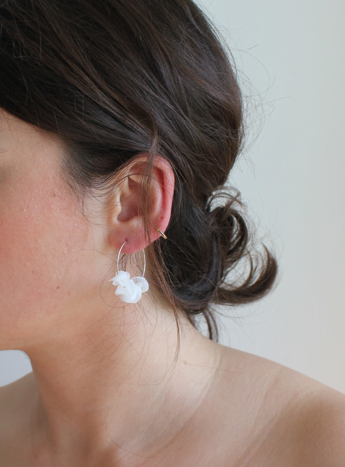 Sustainable 14k gold filled hoops with white petals. Also available in sterling silver. Handmade with recycled metals and upcycled bottles in Arlington, VA. Light weight and fun. Dimensions are 1x1.25 inches.