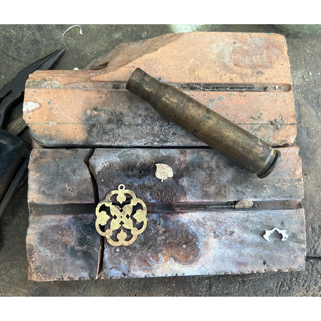 Ironwork artisans, living in an underprivileged community in the Kandal Province, approximately 45 minutes from Phnom Penh, Cambodia, make this recycled bomb shell and bullet jewelry. Bomb casings are left over from Cambodia's wartime three decades ago. Ironwork artisans skillfully mold bomb shells into beautiful jewelry pieces, introducing a small income to underprivileged communities. While Cambodia has enjoyed years of peace and development since the war and atrocities of the brutal Khmer Rouge regime, today 30% of the population still live below the poverty line (on less than $1.25 per day).