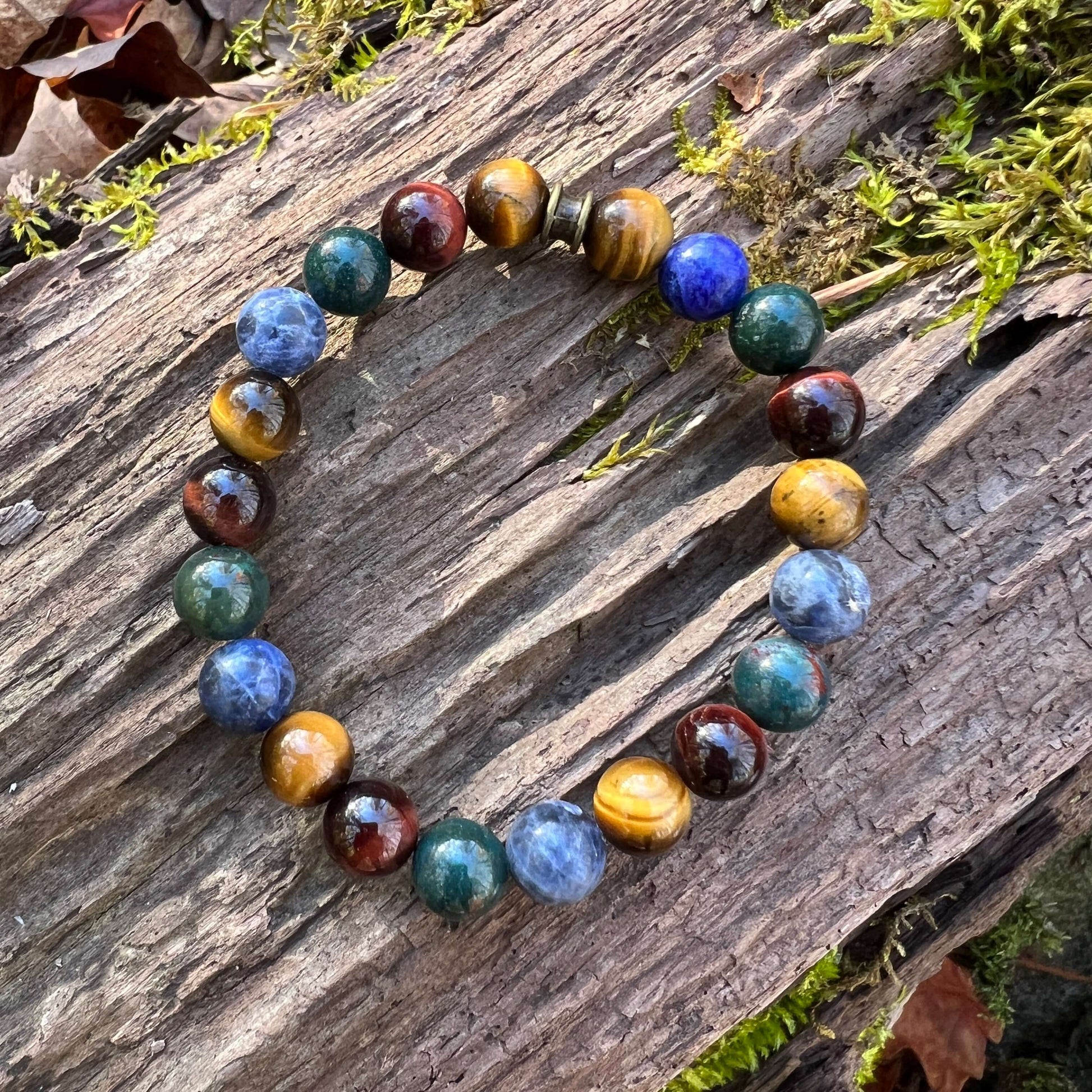 This bracelet is made with two types of Tiger Eye stones, along with Bloodstone and Sodalite. Brought together, this creates a very rooted and grounded energy, allowing the wearer to be clear minded, as well as feeling very secure and protected.