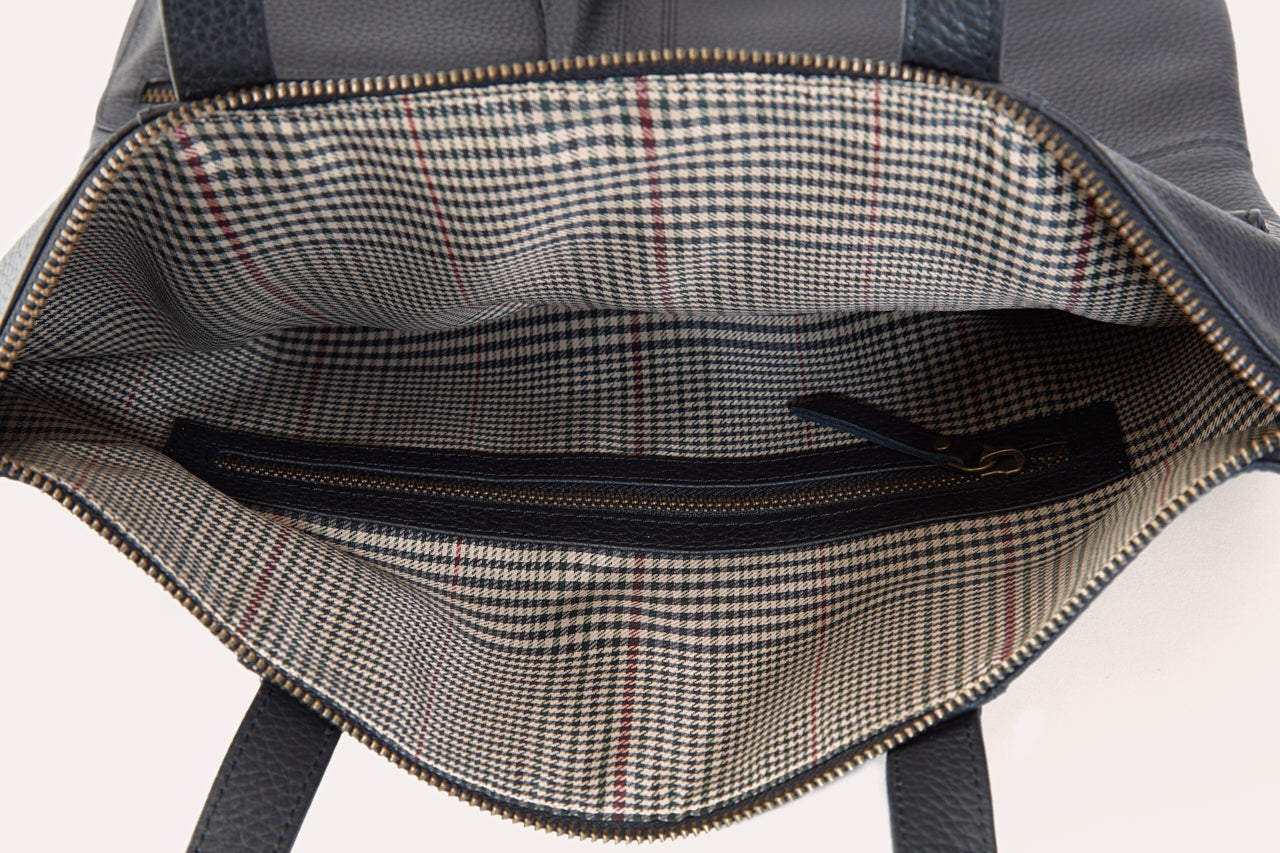 The Fold n Hold Tote features a long bag shape with a softly rounded bottom and two quirky outside pockets. The rich leather is soft and supple with a sophisticated plaid lining. Hang the tote off of your shoulder or fold it over for casual carrying and let the delicate zipper tassels fly out for added charm.