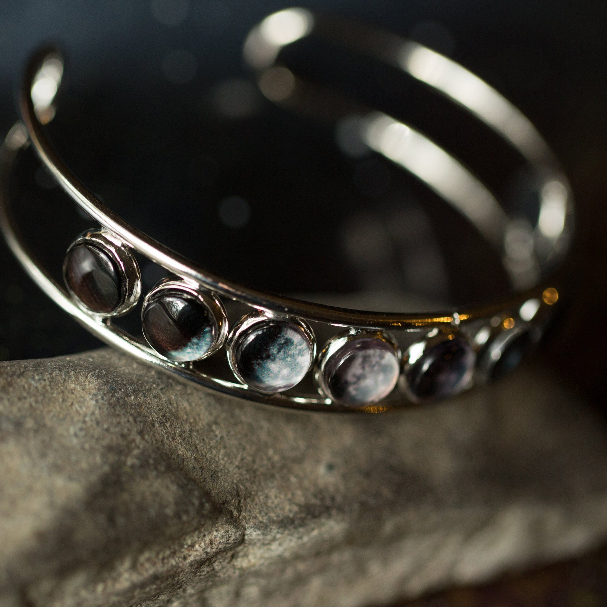 Have you ever wanted our beautiful lunar sister and her many faces hanging about your wrist? In this beautiful and simple cuff bracelet, you can do just that. A lunar celebration, this Moon phase cuff is a simple but unique statement piece. With our design, you get 9 phases of the Moon on an adjustable bracelet. A wonderful gift for a person passionate about astronomy, astrology, science, meditation, wicca, or general new age fashion. Looks great with !