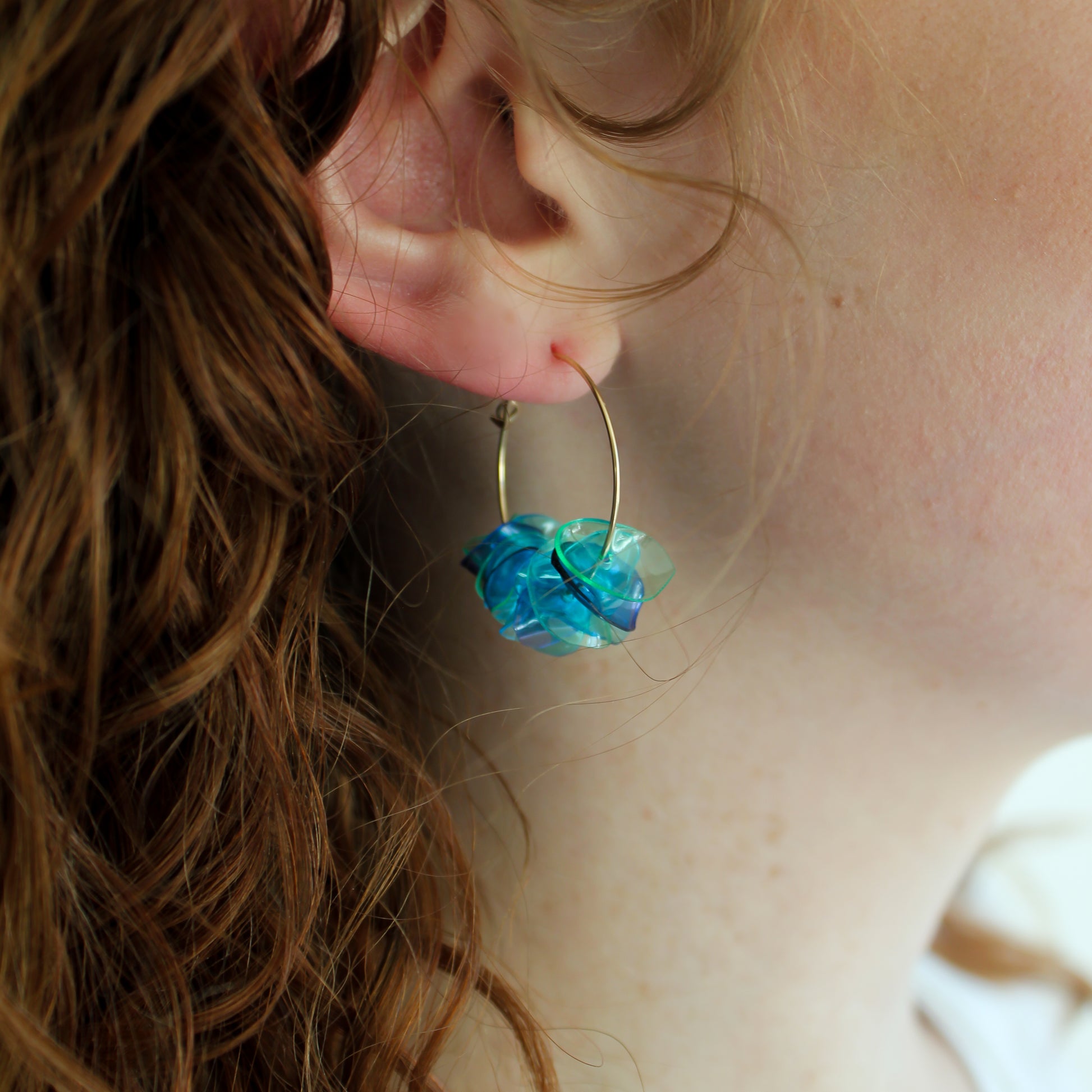 Sustainable 14k gold filled hoops with petals in deep blue, aquamarine and turquoise. Also available in sterling silver. Handmade with recycled metals and upcycled bottles in Arlington, VA. Light weight and ready for the summer. Dimensions are 1x1 inches.