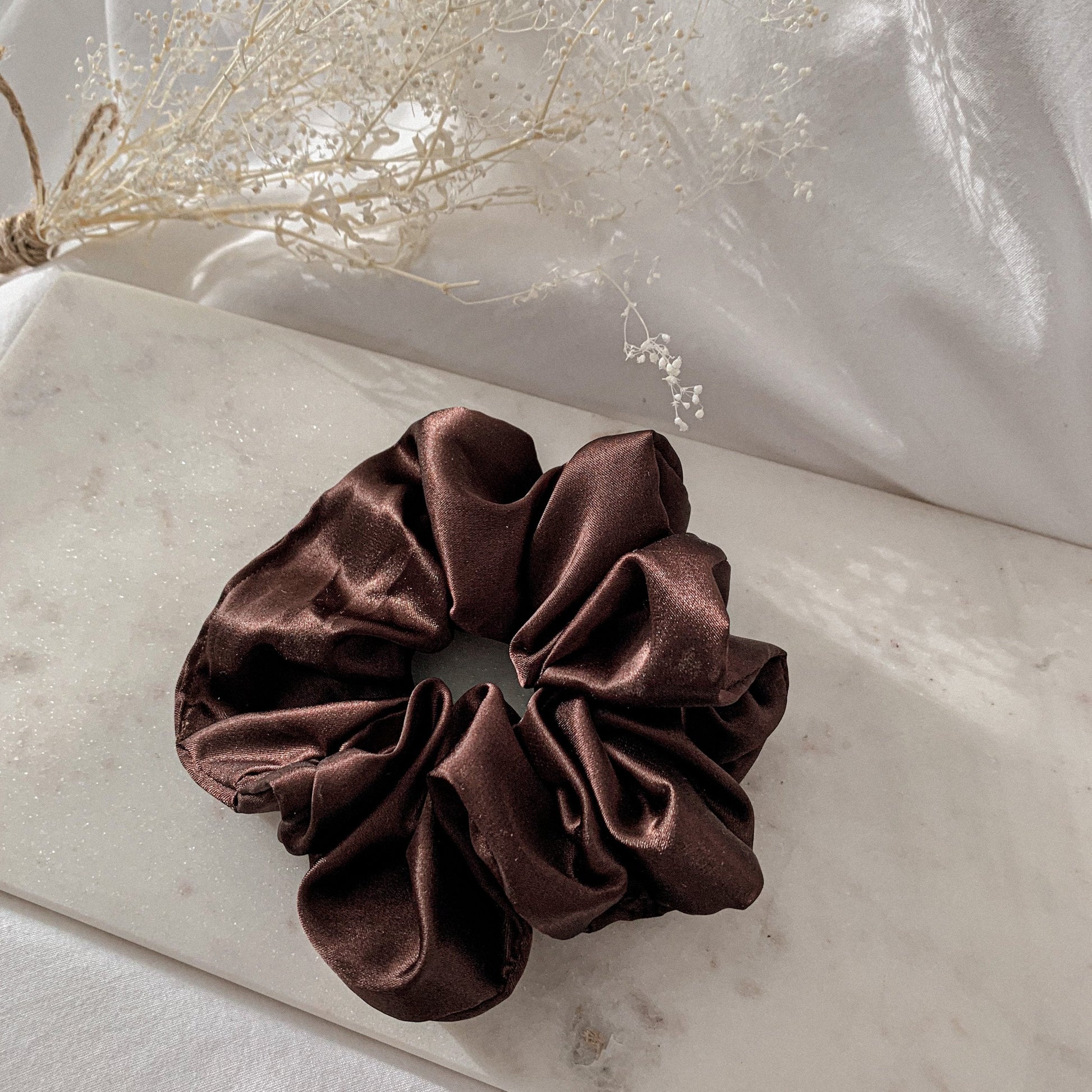 Large, super-soft satin scrunchies that will become a part of your everyday must-haves. Upgrade your top knot or pony or just wear them on your wrist. Choose from a selection of 4 colors: White, Champagne, Espresso, and Black.