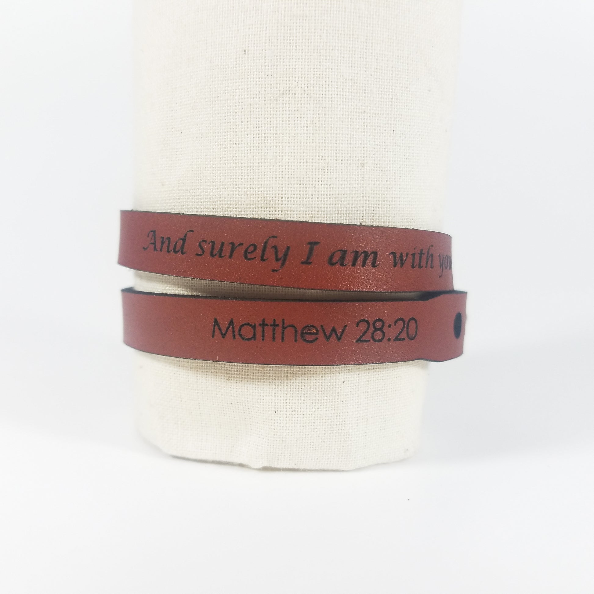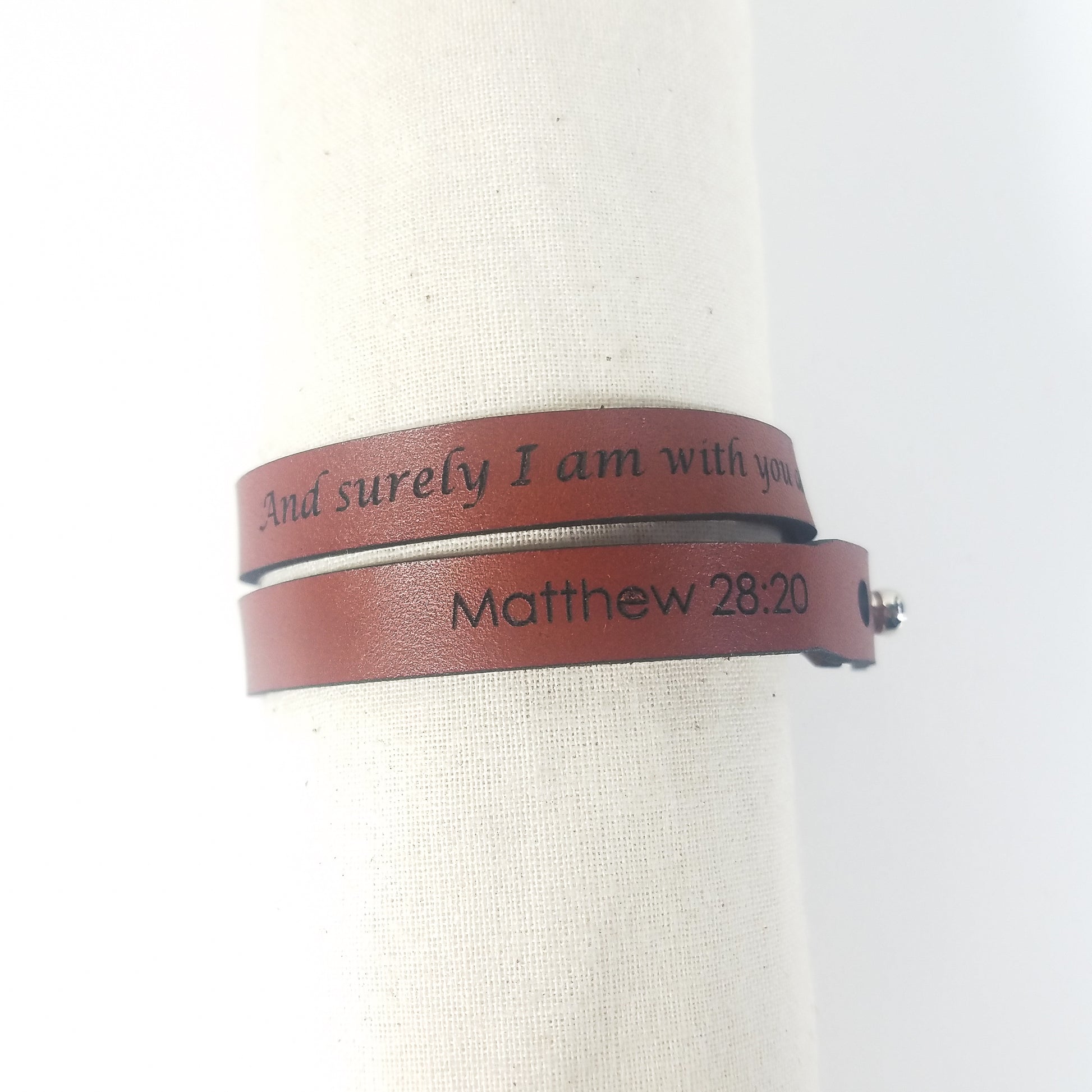 Our spiritual quote wrap bracelets are laser etched on vege-tanned genuine leather. Bracelets wrap around wrist twice and include the chapter reference.